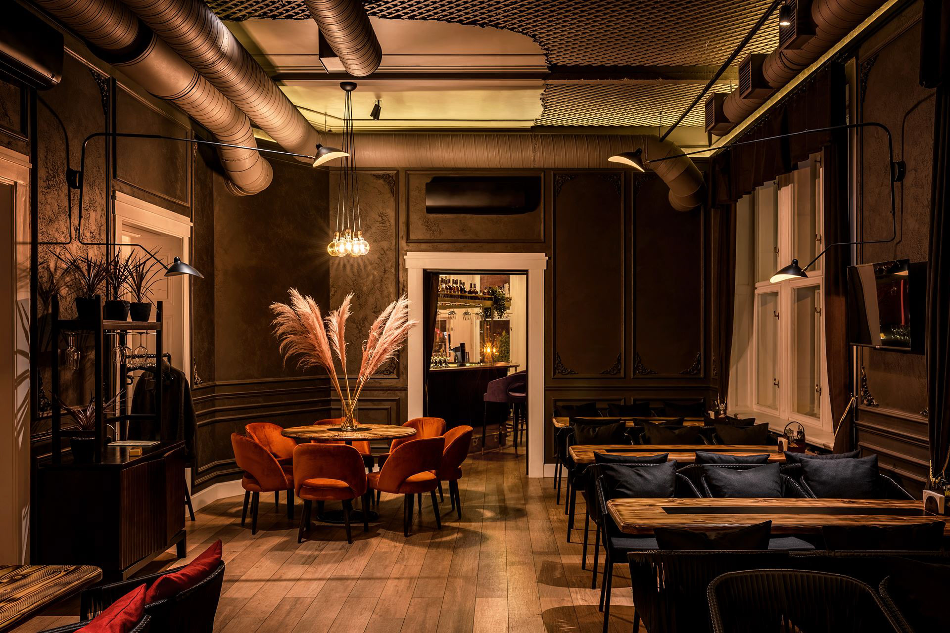 фото декорування столу пампасною травою в центральному в залі ресторану - фотограф інтер'єру та архітектури Львів