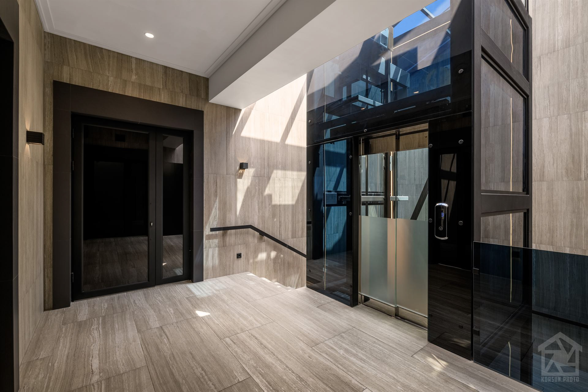 Насправді контрастний інтер'єр - від глибокого антрациту у холі до яскравих сонячних променів верхніх поверхів. Чіткі форми що грамотно підкреслені освітленням дозволили реалізувати кілька ракурсів де комерційне фото архітектури перетворюється на творчу абстракцію.